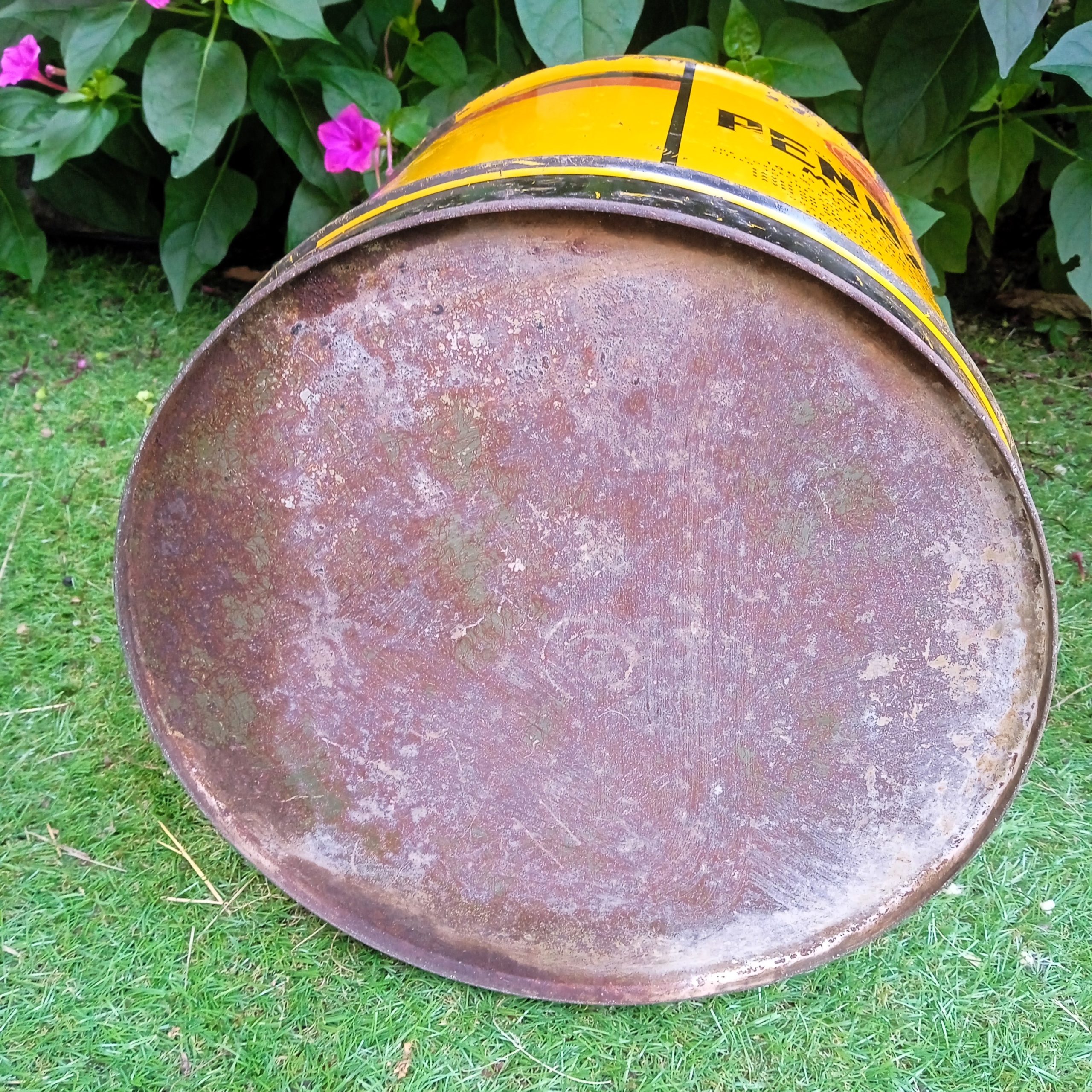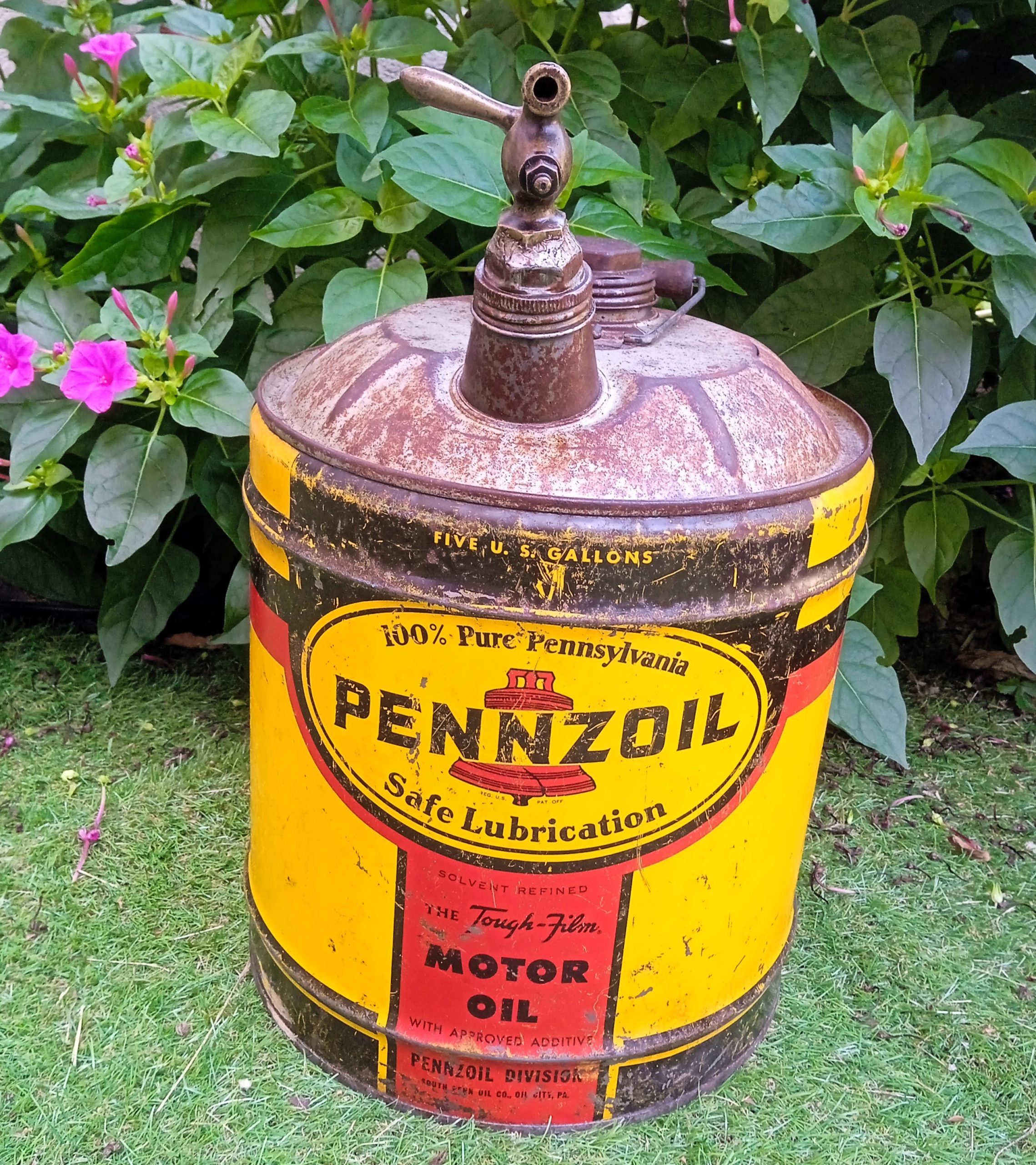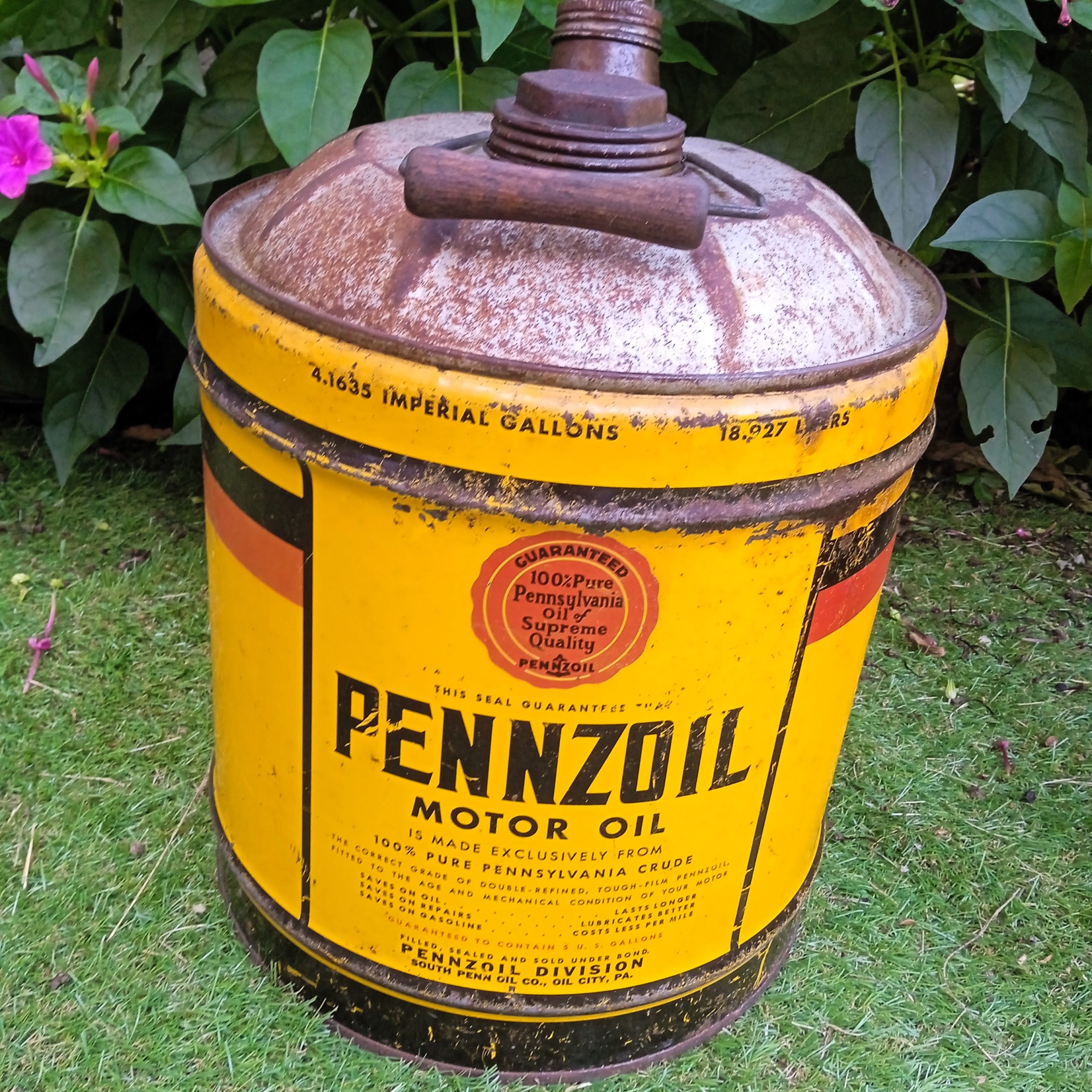 Gros bidon d’huile à moteur 5 gallons 100 % Pure Pennsylvania de la marque Pennzoil, compagnie pétrolière, filiale de Shell dont le siège social est à Houston