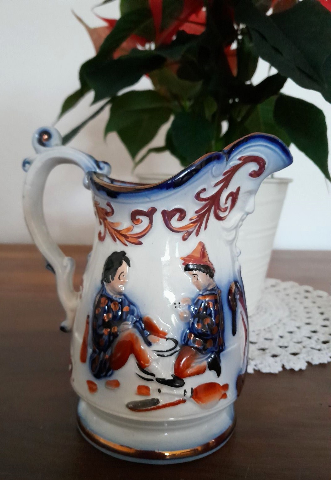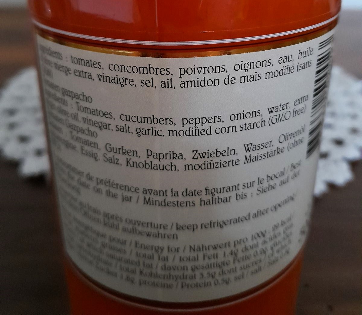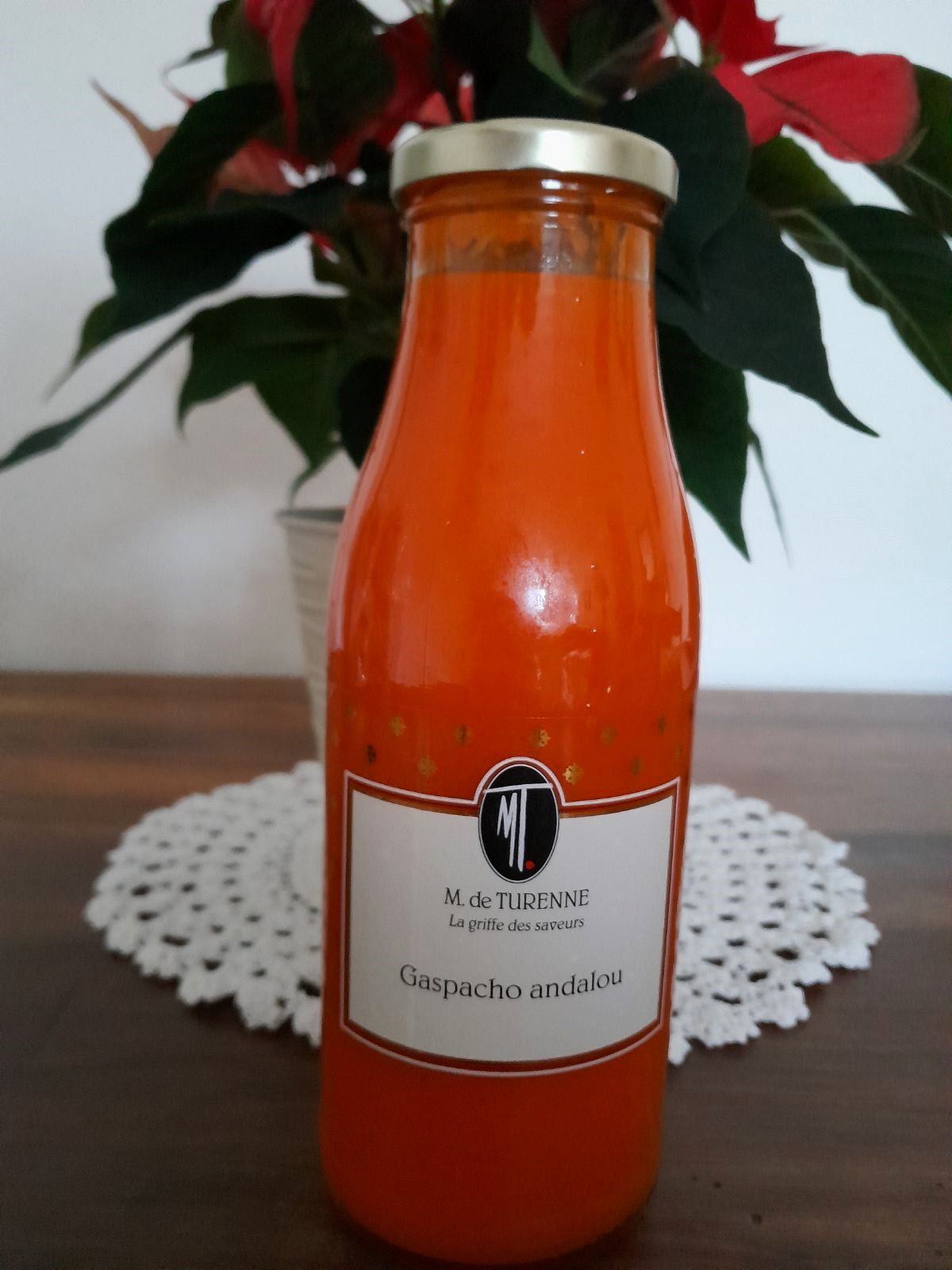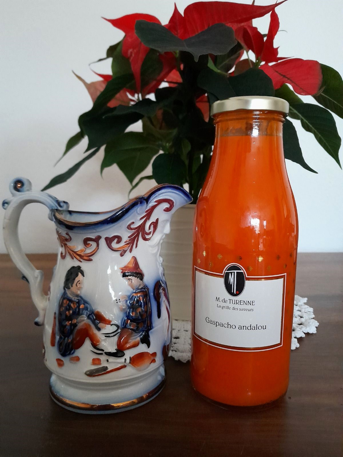 Très joli pichet en Faïence de Bayeux en Normandie, décor cireur de chaussures, aux teintes bleues et bronze sur fond blanc crème accompagné de son Gaspacho Andalou de la Maison de Turenne (ingrédients sur photos)