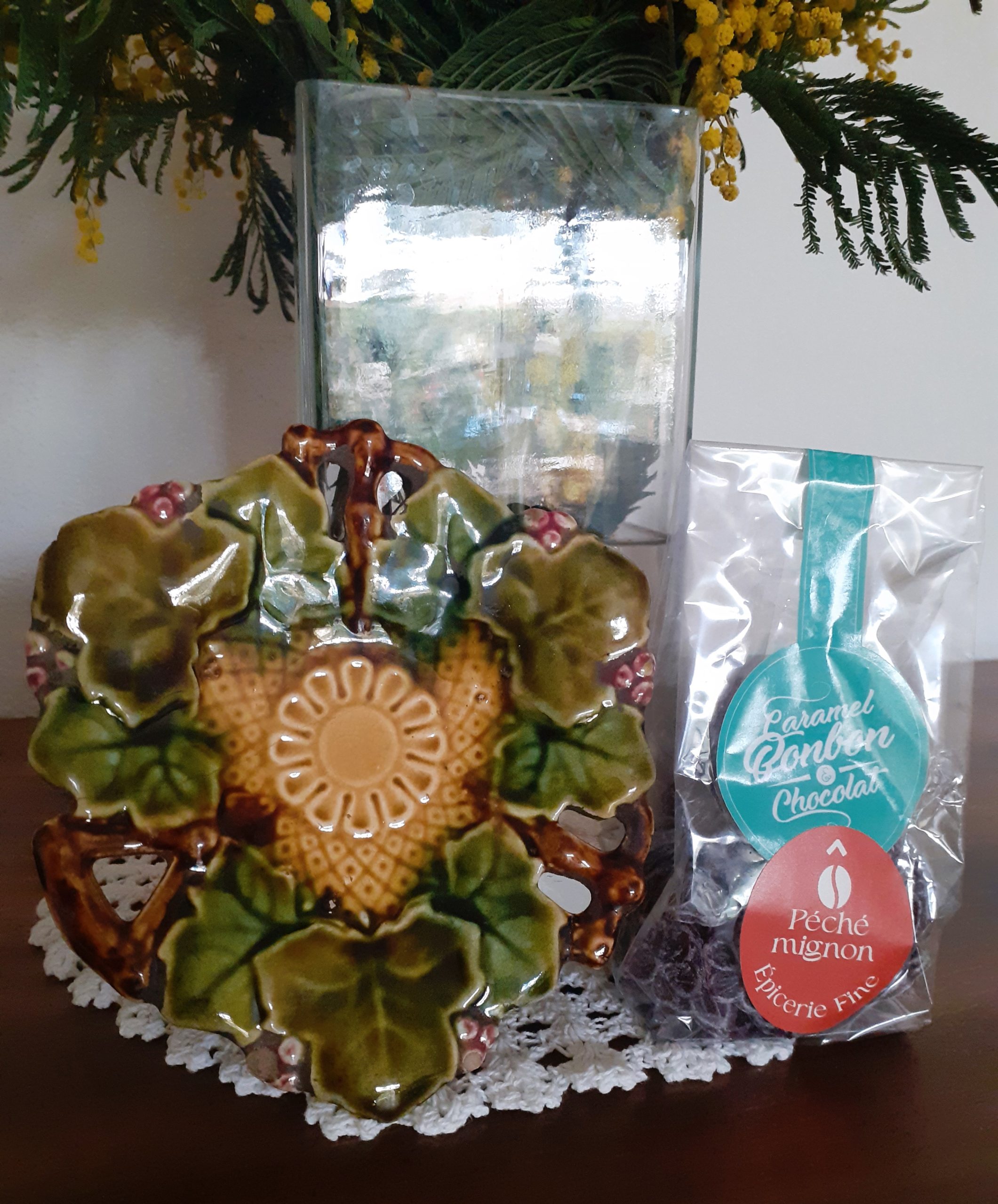 Ramequin feuille en barbotine vintage & bonbons à la violette – Déco gourmande et poétique